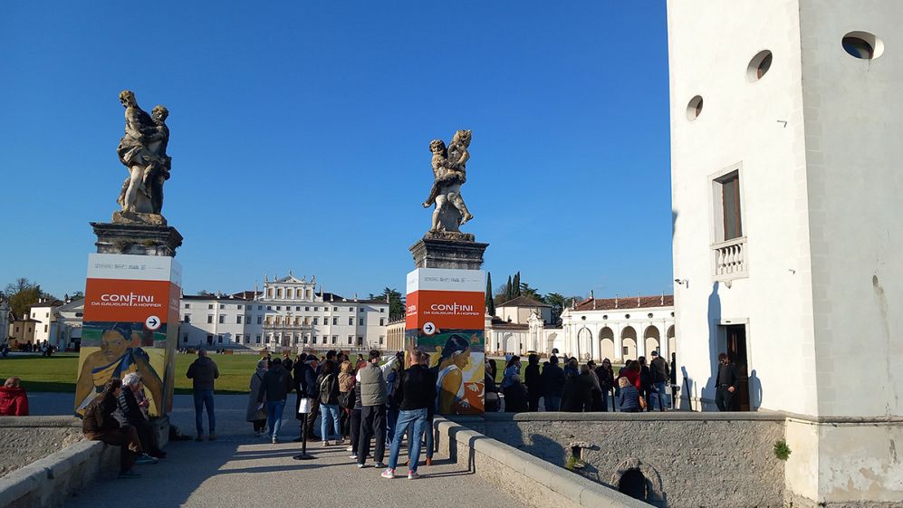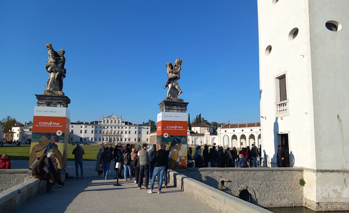 1. fotografija: Čakajoči obiskovalci nadvse uspele razstave MEJE – Od Gauguina do Hopperja v Vili Manin. Kustos Marco Goldin, organizacija ERPAC in Linea d’Ombra (Foto Davorin Devetak)