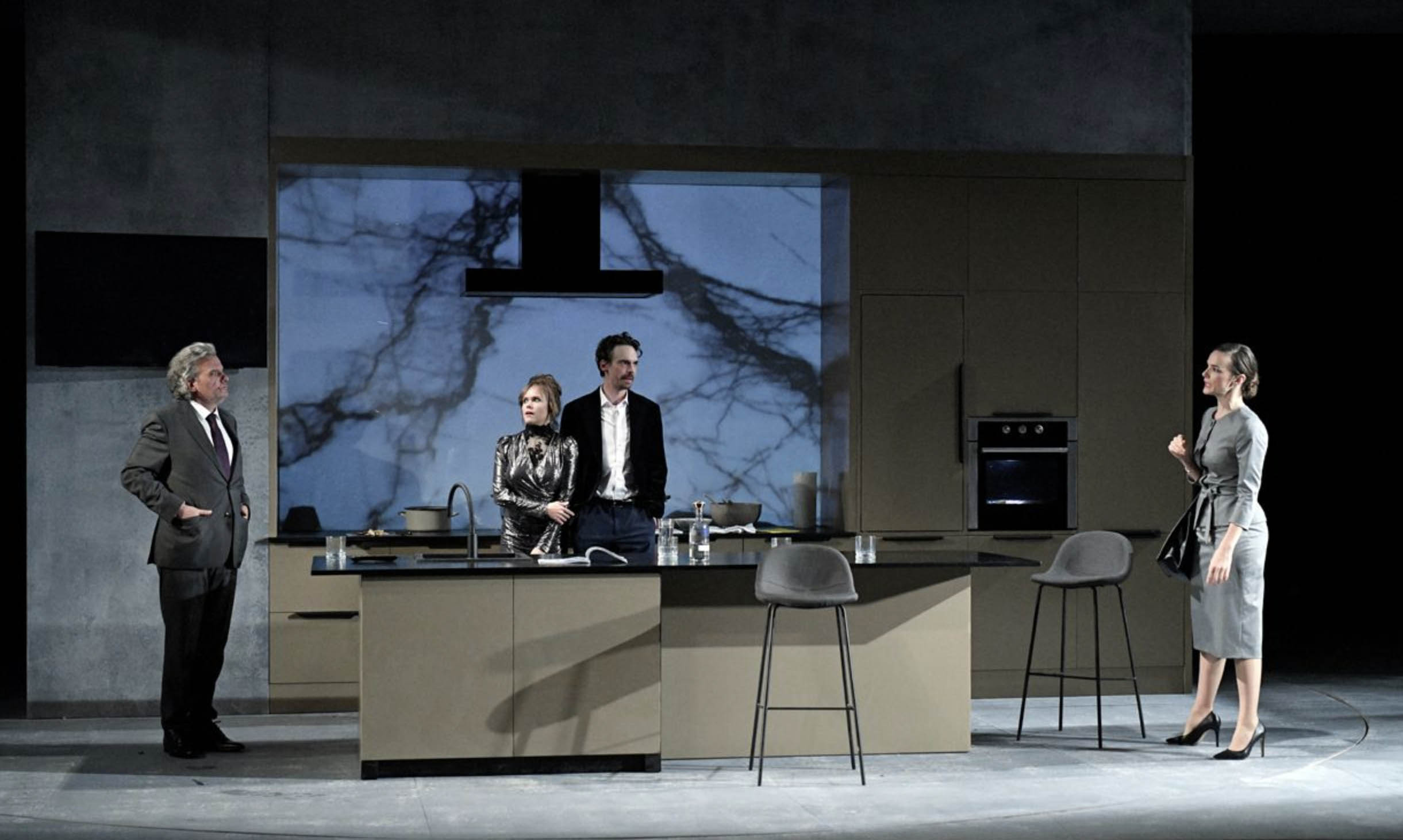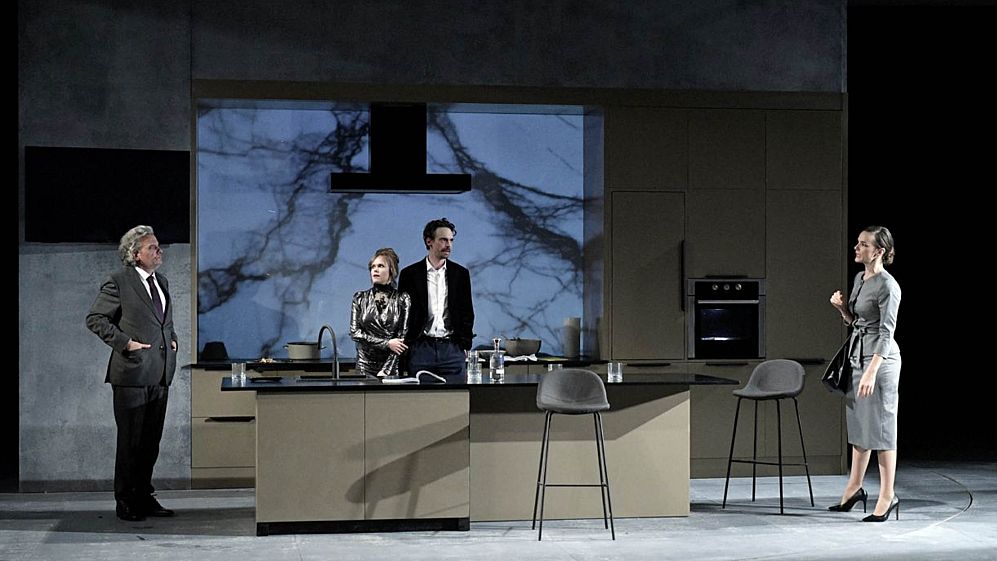 Dodatna vrednost dovršene scenografije Urše Vidic je vrtljivost, ki omogoča učinkovito menjavanje prizorišča za vsako od štirih dejanj. Kostumi Alana Hranitelja, ravno tako sodobni, obenem prikazujejo razliko med skrbno urejenimi bogatuni in bolj sproščeno oblečenim predstavnikom ljudstva, žurnalistom Ščuko (Marko Mandić).