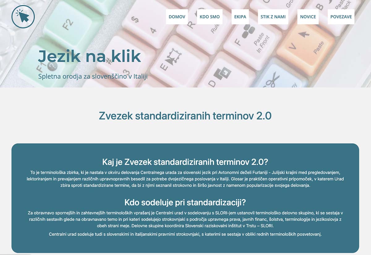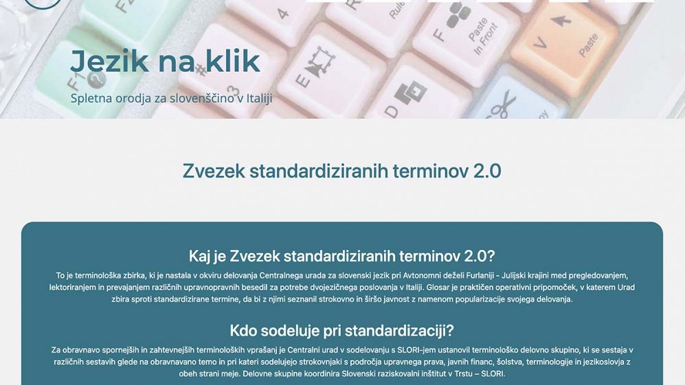 Dolgoletno sodelovanje Centralnega urada za slovenski jezik pri Avtonomni deželi Furlaniji – Julijski krajini in Slovenskega raziskovalnega inštituta (SLORI) iz Trsta je pripeljalo do izjemnega dosežka. Zaživel je Zvezek standardiziranih terminov 2.0 oziroma sodobna različica italijansko-slovenskega glosarja, ki je namenjen piscem in prevajalcem uradnih besedil in drugim uporabnikom. Nov pripomoček, ki je dosegljiv vsem, spodbuja ustrezno strokovno rabo slovenščine v javni upravi in drugih uradnih kontekstih, predvsem pa na območjih slovenske poselitve v FJK. Obširen glosar, ki je na voljo na spletni povezavi zvezek.jeziknaklik.it, vsebuje tudi splošno besedišče, ki prispeva k večji kakovosti prevodov in izvirnih besedil na območju stikanja italijanskega in slovenskega jezika.
