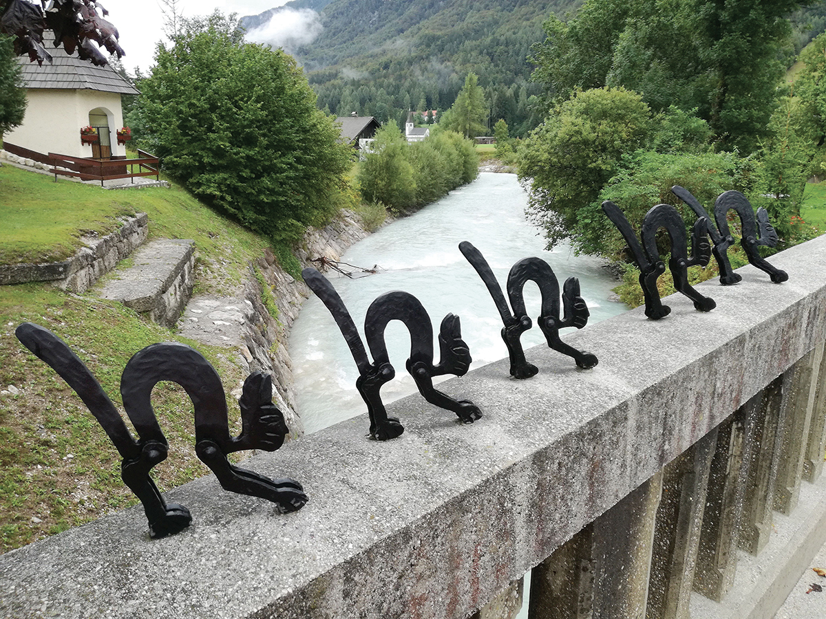 Druga slika: Kovane mačke na mostu čez Savo v Mojstrani