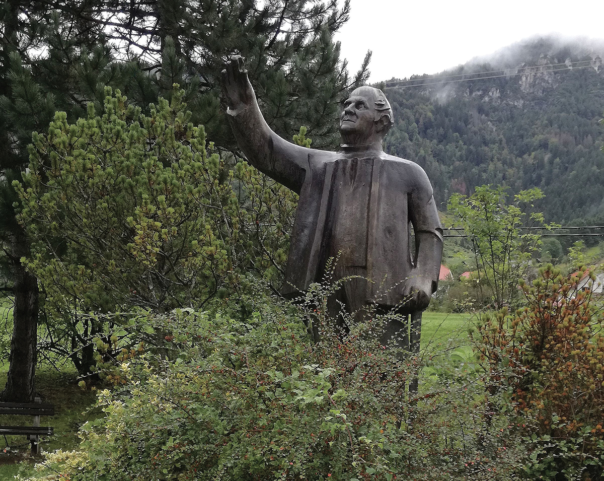 Tretja slika: Kip Jakoba Aljaža, zazrtega gor proti Triglavu