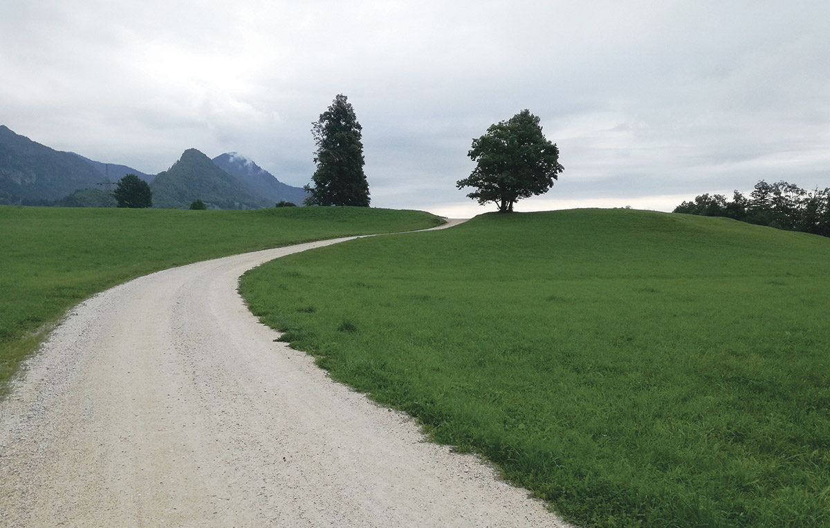 Prva slika: Vijugajoča makadamska pot proti Žirovnici, podobno kot na španskem Caminu