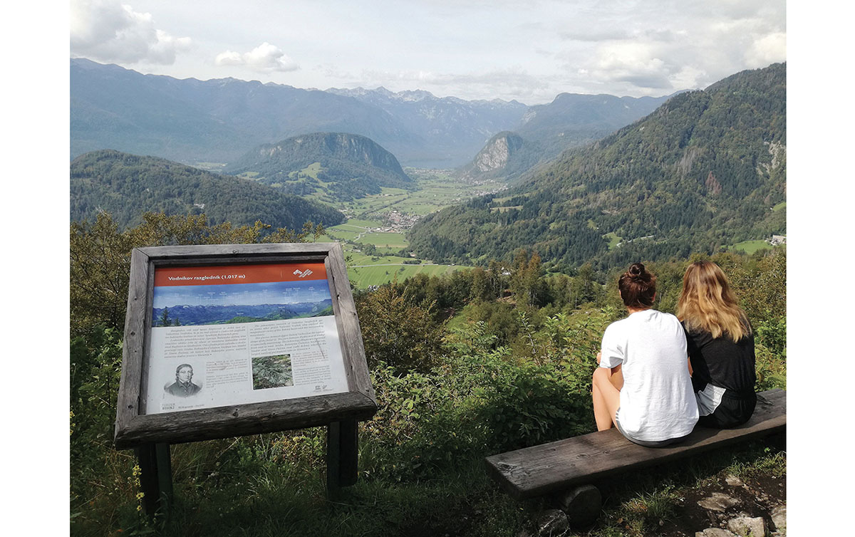 Območju izmenjajočih se čistin s pretežno lesenimi bajticami je sledil daljši odsek hoje po gozdu, kjer je bilo na poti presenetljivo veliko podrtega drevja. Včasih je bil pravi podvig skobacati se čezenj. In potem sem se spustil v Gorjuše, sledil je Koprivnik, malo naprej pa sem se povzpel do Vodnikovega razgledišča, od koder sem imel na dlani Bohinjsko jezero z vso proti nebu dvigajočo se okolico. Vreme je bilo kar pravo za uživanje ob panoramskem razgledu vsenaokrog. Tja sem prišel skoraj sočasno z dvema mladima Nemkama, ki sta mi med kratkim klepetom povedali, da sta na dopustu, ki ga preživljata v hiši, nedaleč stran. Pametni punci. In lušni tudi.