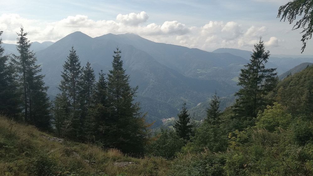 Prva slika: Pogled z Vrha Bače na Podbrdo