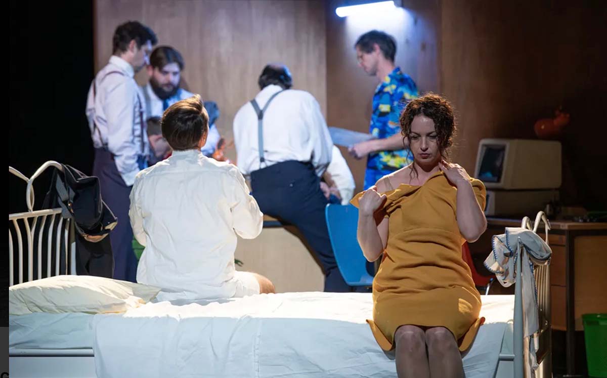 V delu, ki gledalca vabi h globokemu razmišljanju o sedanjem času in prihodnosti, nastopa kar 14 igralcev (skoraj cel novogoriški igralski ansambel), Ana Facchini, Lara Fortuna, Peter Harl, Gorazd Jakomini, Jure Kopušar, Miha Nemec, Medea Novak, Helena Peršuh, Maja Poljanec, Jakob Šfiligoj, Urška Taufer, Žiga Udir, Blaž Valič in Andrej Zalesjak (pa še Rok Cuznar, Filip Čebašek / Jan Svenšek, Brigita Gregorič, Miralem Hrnjica, Blaž Kovač, Gorazd Prinčič, Kaja Trkman), ki odigrajo vrsto različnih “nemih”, gotovo ne v klasičnem smislu razpoznavnih vlog. A prav zaradi njihovih igralskih izraznih spretnosti in dobro naštudiranih koreografskih premikov, ki se ujemajo z nenehnimi gladko potekajočimi scenskimi menjavami, pa iz določeno obdobje odslikavajočih kostumov (Belinda Radulović) gledalec z lahkoto prepozna različne like in razbira razvijanje prizorov. K splošnemu poteku igre pripomorejo tudi scenski elementi (scenograf Igor Vasilijev) in nešteti na prizorišču nakopičeni rekviziti, ki jih igralci in v samo igro vpeto tehnično gledališko osebje prinašajo in odnašajo z odra, kar pa sploh ne moti in ne zaustavlja hitrega ritma predstave, ki se začne na popolnoma golem, do kraja razprtem odru. Hitro se prelivajoči tok dogajanja sicer zahteva budnega, pozornega gledalca. Že v uvodnih taktih, ko gledamo izgrajevanje nekega jeklenega zidarskega ogrodja, nas predstava vpelje v naglo odrsko prehajanje iz prizora v prizor. Z nekakšnega zidarskega gradbišča in industrijskega prizorišča dogajanje preide v pisarniško okolje, med stene domačega doma nekaterih “dramskih” oseb in še drugam.