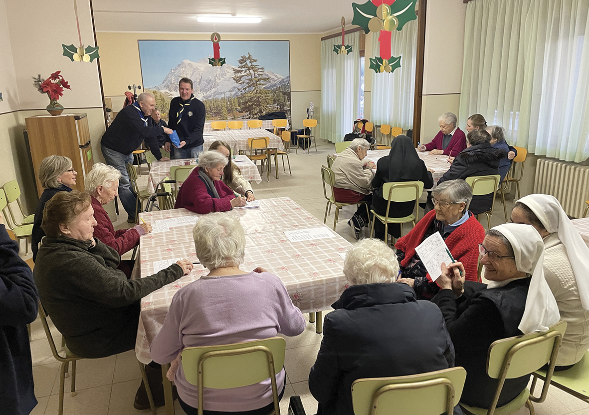 Člani KAOS-a (Klana aktivnih odraslih skavtov iz Gorice) so v zadnjem mesecu imeli kar dve lepi srečanji. V prazničnem vzdušju so 22. decembra 2023 popestrili popoldan starejšim gospem, varovankam v goriškem Zavodu Sv. Družine. Zapeli so ob zvokih kitare, načelnik klana Mauro Leban jim je spregovoril nekaj priložnostnih besed ter izrazil iskreno voščilo, pozdravila je tudi načelnica SZSO Gorica Nika Cotič. Nekateri starejši klanovci so se s toplimi spomini vrnili v zavod, kjer so v mladih letih preživeli marsikatero leto, za kar so sestram še vedno hvaležni. Kaosovci so gostje zavoda in sestre tudi razvedrili s tombolo, nazadnje so vsaki poklonili še božično darilce.