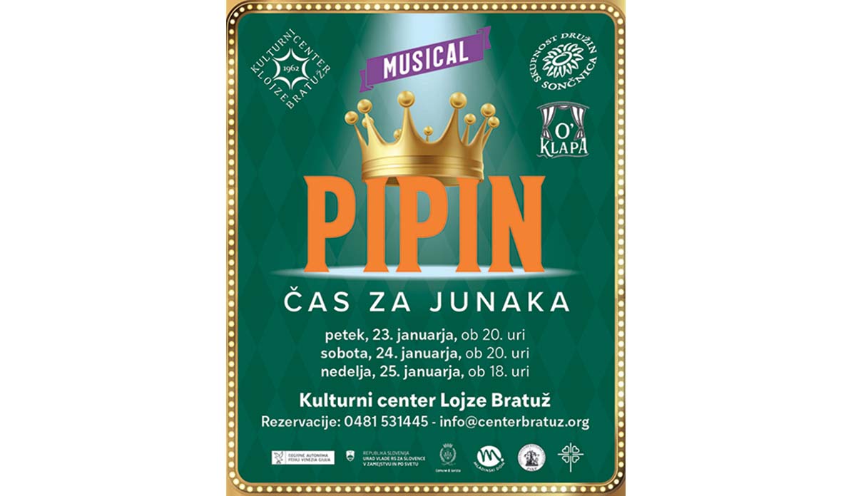 Muzikal Pipin – Čas za junaka je prosto povzet po izvirniku Pippin in pripoveduje zgodbo o mladem Pipinu, ki išče smisel življenja in lastnoidentiteto. Na svoji poti preizkuša različne življenjske vloge, od vojskovanjain hrepenenja po slavi do politične moči, vendar ga nobena izmed njih zares neizpolni. Predstava se odvija kot igra znotraj igre, ki jo vodi skrivnostnaskupina potujočih igralcev z Vodjo predstave na čelu, ki Pipina vodi, izziva inspodbuja k iskanju lastne resnice. Zgodba je podana na humoren in komičennačin, polna igrivih preobratov, hkrati pa gledalca z dinamično scenografijo, kostumi, glasbo in plesom popelje v magičen, nekoliko nor srednjeveški svet, kinavdušuje tako z zabavo kot s sporočilnostjo. Igralski ansambel tokratnega muzikalasestavljajo (na fotografiji z leve) Gabrijela Vidmar, Marco Fior, Bernard Hrovatin, Iris Gulin, Daniela Klanjšček, Kea Vogrič, Sanja Vogrič, Noemi Iacono,Irena Raseni, Simon Čavdek in Manuel Leonzini. Več o delu mladih pišemo v drugem članku (klikni in preberi).