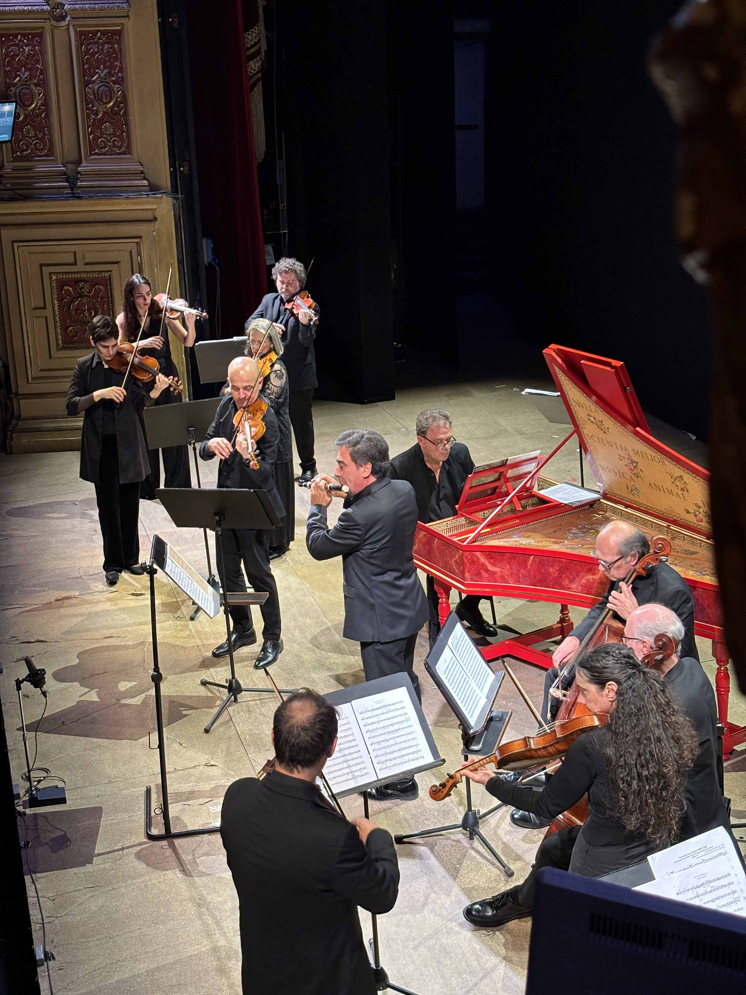 Odlični mojstri Alessandro Tampieri (violina), Marcello Gatti (flavta), Maria Grokhotova, Lisa Ferguson in Paolo Zinzani (prva violina), Sara Meloni, Mauro Massa in Lavinia Soncini (druga violina), Marco Massera in Maria Cristina Vasi (viola), Alessandro Palmeri in Paolo Ballanti (čelo) ter Giovanni Valgimigli (violone) so kar stoje, dirigent Ottavio Dantone pa pri čembalu, zaigrali Bachov 5. Brandenburški koncert BWV 1950 in Telemannov koncert za flavto, violino in godala Twv 52. V nadaljevanju je bil kvartet za flavto, violo in čembalo Wq 93 Bacha sina ter trojni koncert za flavto, violino, čembalo in godala Bacha očeta BWV 1044. V tem so se sijajni toni strun skoraj prelevili v svetle izrisave trobil ali glasov. Accademio Bizantino sem že užival med nočnim radijskim poslušanjem klasične glasbe Rai ob njeni prefinjeni interpretaciji Bachove Die Kunst der Fuge (Umetnosti fuge).