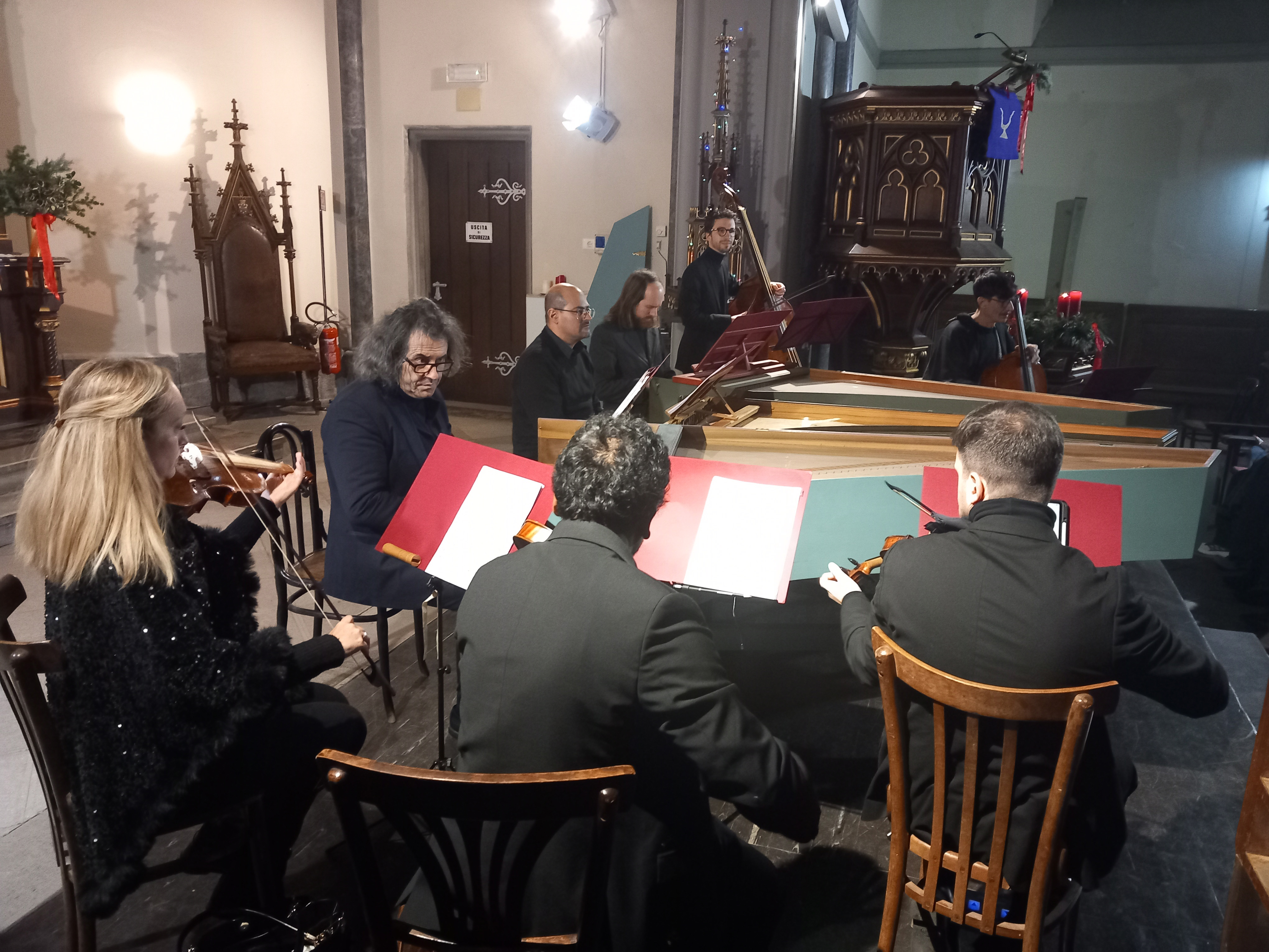 3. fotografija: Trije čembali in godala za božansko baročno glasbo JSB v isti tržaški cerkvi. Koncert Infinito Bachiano (Neminljivi Bach) je priredila 14. decembra Družba za koncerte v Trstu. (Foto Davorin Devetak)