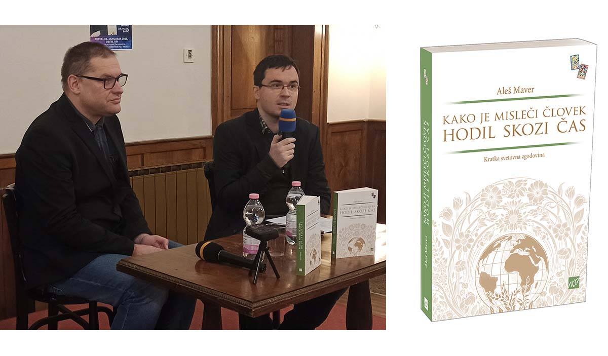 dvorani frančiškanskega samostana na Kostanjevici je 23. januarja zgodovinar in publicist Aleš Maver predstavil svojo novo knjigo Kako je misleči človek hodil skozi čas, pogovor z njim je vodil prijatelj Matic Batič. Aleš Maver poučuje zgodovino starega veka in latinščino na Filozofski fakulteti Univerze v Mariboru in je o tem večkrat pisal. Spomnimo se njegovih prejšnjih knjig Od klinopisa do Teodore ali Kapljica izdolbe kamen. Ukvarja se tudi z zgodovino 19. in 20. stoletja, piše kolumne, v katerih je veliko humorja in anekdot, za različne publikacije in se redno pojavlja kot pronicljiv komentator družbeno-političnega dogajanja. Njegova nova knjiga skuša predstaviti svetovno zgodovino na popolnoma nov način. Zaradi tega se mu je zdelo smiselno vzeti za izhodišče današnje, sodobno stanje. Odločil se je za predstavitev človeške zgodovine v štirih približno enakih delih (glede na število prebivalcev).