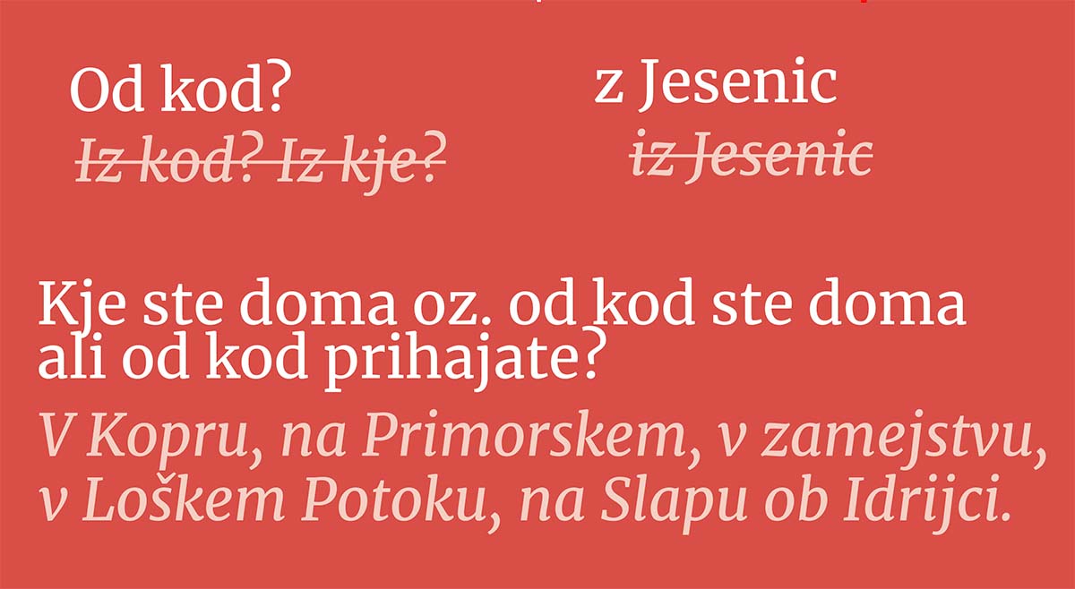 Zakaj danes tako dolg uvod? Ker sem skušala nanizati čim več samostalnikov, ki skupaj s predlogi odgovarjajo na vprašanje: Kje ste doma oz. od kod ste doma ali od kod prihajate? V Kopru, na Primorskem, na vseh koncih Slovenije, v zamejstvu, v Loškem Potoku, na Slapu ob Idrijci. Iz Kopra, s Primorskega, z vseh koncev Slovenije, iz zamejstva, iz Loškega Potoka, s Slapa ob Idrijci. Pri tem namreč prihaja najmanj do dveh vrst napak. Namesto da bi pravilno vprašali “od kod?”, vse prepogosto slišimo neustrezno “iz kod?” ali celo “iz kje?”. V odgovorih pa poslušamo npr. “iz Jesenic”, čeprav smo “na Jesenicah” in bi bilo torej prav “z Jesenic”. Včasih pa tudi, ne boste verjeli, kdo rabi “na Primorski”, namesto “na Primorskem”. Oglejmo si lepo po vrsti, kako je prav.