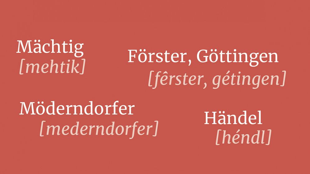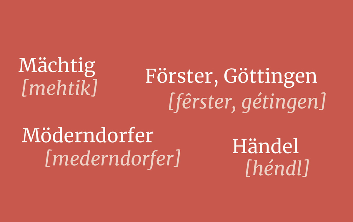Med njimi je tudi nam bližja nemška pisava, po nemško pa sta zapisana tudi priimka Mächtig in Möderndorfer. Kako torej izgovoriti ä in ö, ki označujeta glasova, ki ju v slovenski knjižni izreki ni? Čim bolj podomačeno oz. čim bližje kateremu od podobnih glasov slovenskega knjižnega jezika. Za ä in ö je to [e], torej izgovorimo [mehtik] in [mederndorfer]. Podobna primera, po katerih se lahko zgledujemo, sta v Slovenskem pravopisu 2001 v preglednici za nemško pisavo: Händel – [héndl], Förster, Göttingen – [fêrster, gétingen].