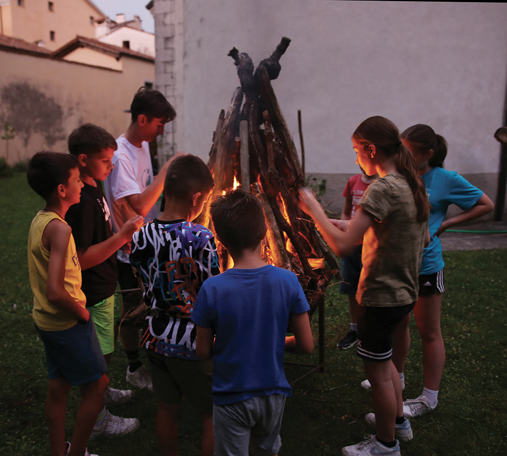 Preden so se navzoči – v posebno veselje številnih mladih – zbrali ob kresu na dvorišču za cerkvijo, jim je prof. Elia Bastjančič v Močnikovem domu spregovoril o tradiciji kresovanja. Prižig ognja je tesno povezan z likom sv. Janeza Krstnika. Poletni solsticij že od časa neolitika velja za sveti čas, ko se sonce in luna “poročita” in iz njunega zakona izhaja energija, ki prežema ves kozmos. Z nastopom krščanstva poletni sončev obrat, ko se sonce začenja manjšati oz. umirati, zaznamuje praznik rojstva sv. Janeza Krstnika, tistega, ki je bil poslan, da bi naznanil, da bo mesija rasel, on pa se manjšal oz. umiral. Kresovi od davnine “ščitijo novi svet”, solsticij so vrata v novo dobo; na podoben način sv. Janez Krstnik predstavlja vrata v novo, Kristusovo dobo. V kresovanju se spajajo tradicije, ki imajo korenine v starodavnih običajih različnih evropskih narodov, kar priča o tem, da smo nekdaj bili in še vedno smo vsi bratje.