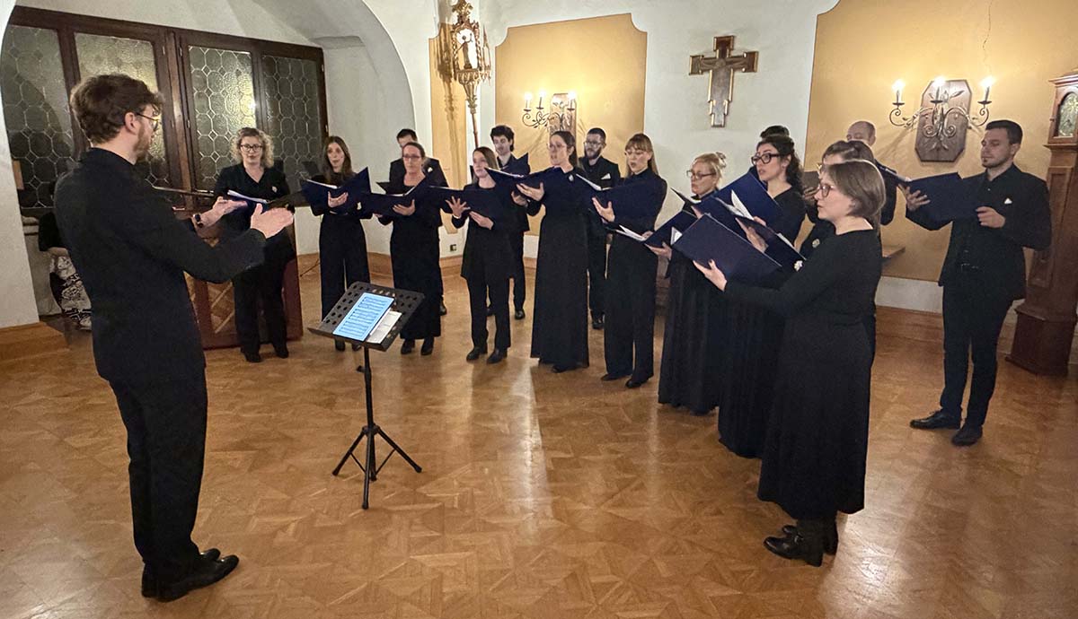 Zbor, ki je nastal pred desetimi leti, združuje mlajše glasbenike iz naše dežele, ljubitelje zborovske – sakralne, posvetne in ljudske – glasbe vseh obdobij, od gregorijanskega petja prek baroka pa vse do sodobnih tokov. Rad raziskuje bolj ali manj znane avtorje ter z njihovimi skladbami nastopa na različnih revijah, nenazadnje na pobudah zveze Usci Fvg. V zadnjih mesecih ga je projektno vodil goriški zborovodja David Bandelj: z izpiljenim programom adventne in božične glasbe od renesanse do naših dni je uspešno nastopil na različnih odrih naše dežele. Na petkovem koncertu pa je zbor nastopil pod taktirko tržaškega maestra Danieleja Pilata, ki se je oblikoval na Dunaju in v Salzburgu, že več let pa uspešno deluje v Nemčiji. Pilato je na goriškem koncertu uvodoma spregovoril o svoji izkušnji z zborom, ki si zastavlja ambiciozne cilje in jih zmore tudi uresničevati; pred vsakim sklopom skladb je poslušalcem orisal in približal njihove vsebine. Program koncerta je bil zasnovan kot raziskovanje romantičnega duha, razpetega – kot je nakazal podnaslov dogodka – med hrepenenjem po neznanem in otožnostjo znanega. Občinstvo je doživelo glasbo, ki je prepletala intimno nostalgijo z drzno izraznostjo, značilno za romantično obdobje. Repertoar z biseri velikih romantičnih skladateljev, kot so Felix Mendelssohn, njegova sestra – premalo poznana skladateljica! – Fanny Hensel Mendelssohn, Schubert in Brahms, je ponudil širok spekter razpoloženj, od zadržane liričnosti do dramatičnih vrhuncev, ki so poslušalce popeljali skozi notranje krajine občutij. Posebna gostja večera je bila odlična sopranistka Giulia Della Peruta iz Vidma, katere solistični nastop – ob spremljavi klavirja in klarineta – je dodatno obogatil zvočno podobo koncerta. Tri skladbe je odpel cel zbor, po dve kvartet in ženski del zbora. Ambient zgodovinske dvorane je koncertu dodal še posebno dimenzijo. Akustika prostora in njegova arhitekturna eleganca sta podprli subtilne odtenke romantične glasbe ter ustvarili vzdušje, ki je vabilo k zbranemu poslušanju.