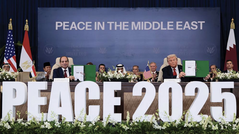 V Egiptu se je srečal s približno tridesetimi svetovnimi voditelji, med drugimi z egiptovskim predsednikom Abdelom Fattahom al-Sisijem, predsednikom Palestinske oblasti Mahmoudom Abbasom in italijansko premierko Giorgio Meloni. Na srečanju, ki je bilo predstavljeno kot začetek druge faze mirovnih pogajanj, je bila podpisana deklaracija o miru v Gazi, dokument o prihodnosti tega ozemlja, ki pa je vendar ostal vsebinsko nejasen. Predvideva namreč postopni umik izraelskih sil in oblikovanje novega civilnega upravljanja, a brez določenih rokov ali konkretnih zavez. Dokument je zelo splošen in brez konkretnih časovnih okvirov, kar je sprožilo kritike, da gre bolj za simbolično gesto kot za dejanski politični preboj. Podpisali so ga še predsednik Egipta ter voditelja Katarja in Turčije, šejk Tamim bin Hamad al Tani in Recep Tayyip Erdogan.